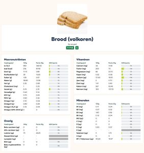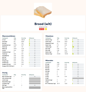 Hieronder is het verschil in voedingstoffen terug te zien tussen volkorenbrood en witbrood. Er is te zien dat de Food Value Score (FVS) beduidend lager is voor witbrood omdat het beduidend minder voedingsstoffen bevat.